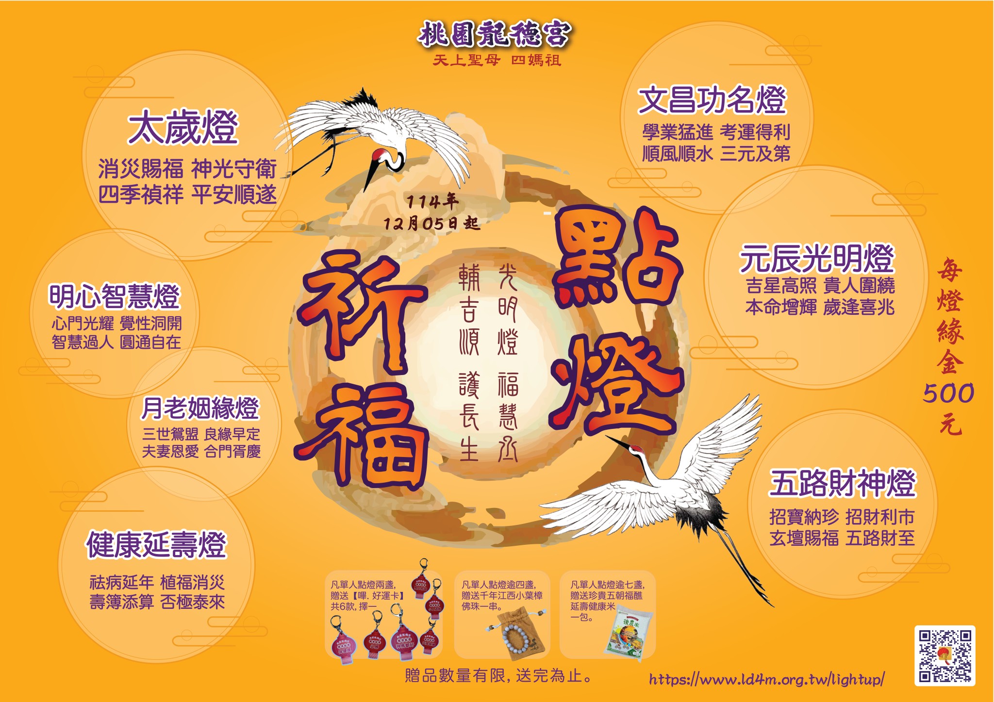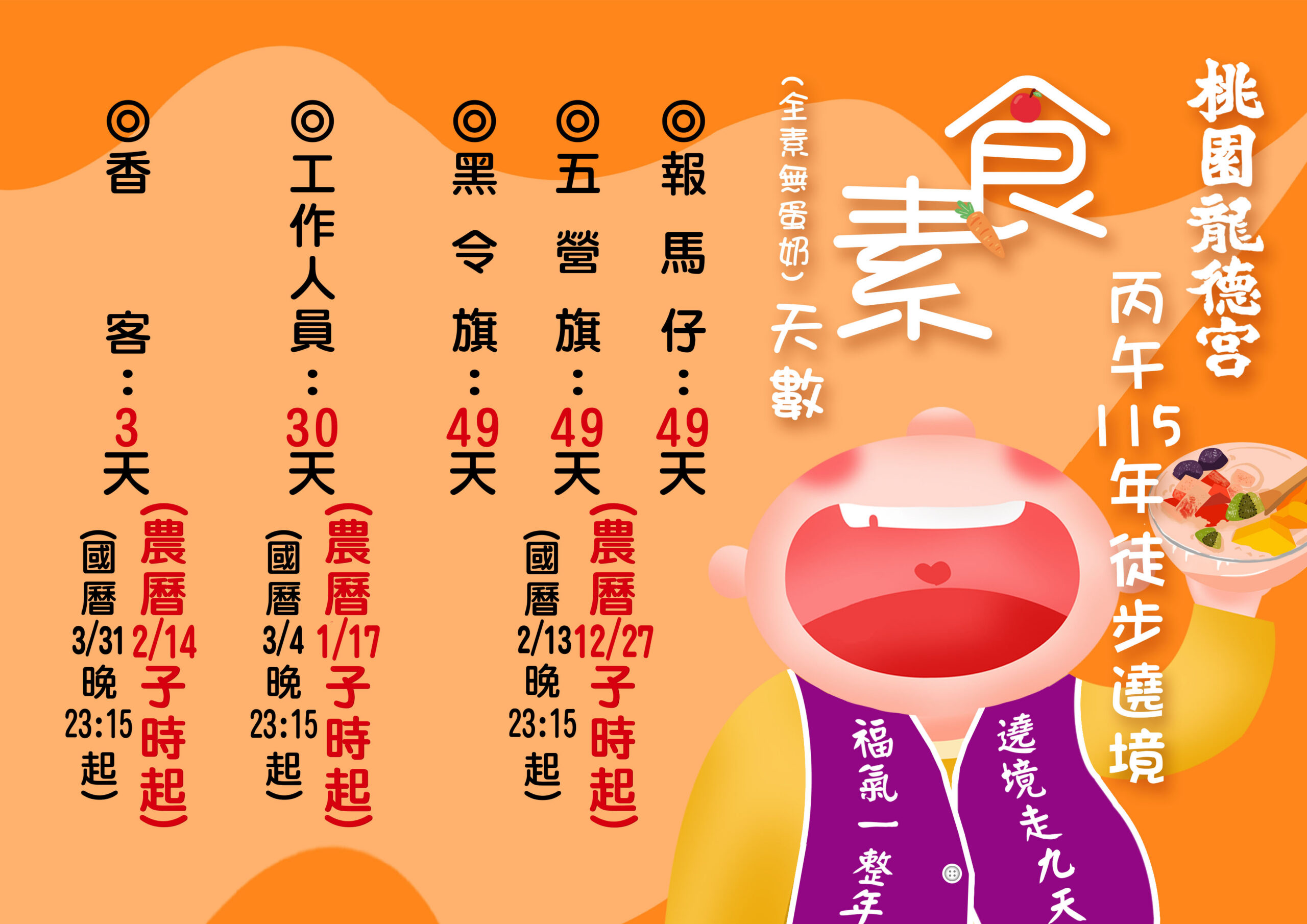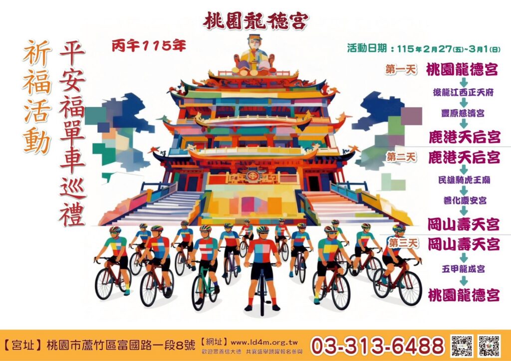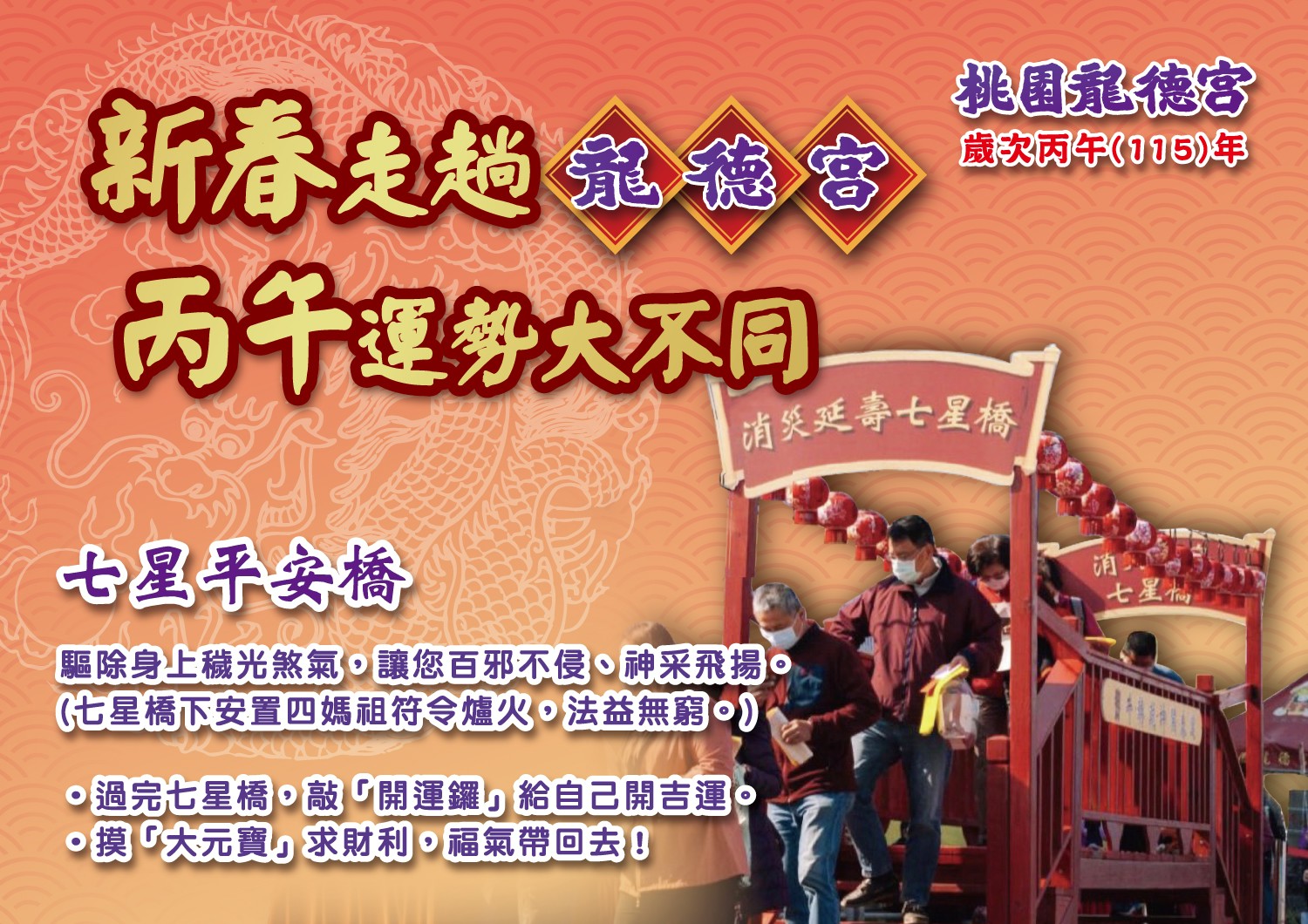距離 丙午年遶境 訪客人數: 12151 懺悔之路 心田甘露~祈安遶境,撫順安民,護持眾生。天上聖母 四媽祖聖駕南巡,引領十方善信,百里行腳,一步赦一業,消災解厄,福氣延綿。殷盼眾善信大德偕伴,行功了願步行訓體,普受神庥澤被,吉祥圓滿,是所至禱! 最新消息 停辦聖事公告 2026/01/10 閱讀全文 消災延壽七星平安橋 2026/01/10 閱讀全文 丙午(115)年開工吉日 2026/01/09 閱讀全文 丙午(115)年南巡祈安遶境 2025/11/19 閱讀全文 十二生肖,怎樣點燈最有效 2025/12/4 閱讀全文 隨香公告 2025/01/01 閱讀全文 陣頭介紹 2025/01/01 閱讀全文 丙午(115)年補春運 2026/01/10 閱讀全文 丙午(115)年財利亨通發財金 2026/01/09 閱讀全文 丙午(115)年新春系列活動 2026/01/09 閱讀全文 丙午(115)年安太歲.點光明燈 2025/11/28 閱讀全文 遶境食素天數 2026/01/02 閱讀全文 行旅規範 2025/01/01 閱讀全文 行李袋購買 2025/01/01 閱讀全文 遶境介紹 媽祖信仰是臺灣人民最普遍的民間信仰之一,桃園龍德宮於每年初春奉行 玉皇上帝與天上聖母 四媽祖旨諭進行9天8夜徒步南巡祈安遶境活動,堪稱「轟動北台灣的媽祖遶境聖事」。天上聖母 四媽祖引領十方善信,百里行腳,一步赦一業,消災解厄,福氣綿延。殷盼善信大德偕伴護法隨駕,行功了願,秉奉丹心,步行訓體,得受神庥澤被,吉祥圓滿。 更多遶境介紹 懺悔之路 心田甘露 懺悔之路 心田甘露國曆115.04.04-04.12 (農曆02.17-02.25)徒步遶境 百里行腳 福氣綿延 攜手走向 希望之路 駐駕友宮 桃園龍德宮 後龍江西正天府 豐原慈濟宮 鹿港天后宮 民雄騎虎王廟 善化慶安宮 岡山壽天宮 五甲龍成宮 福報的秘密 福氣小物 Views: 4738