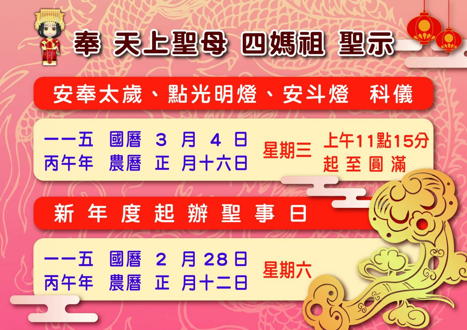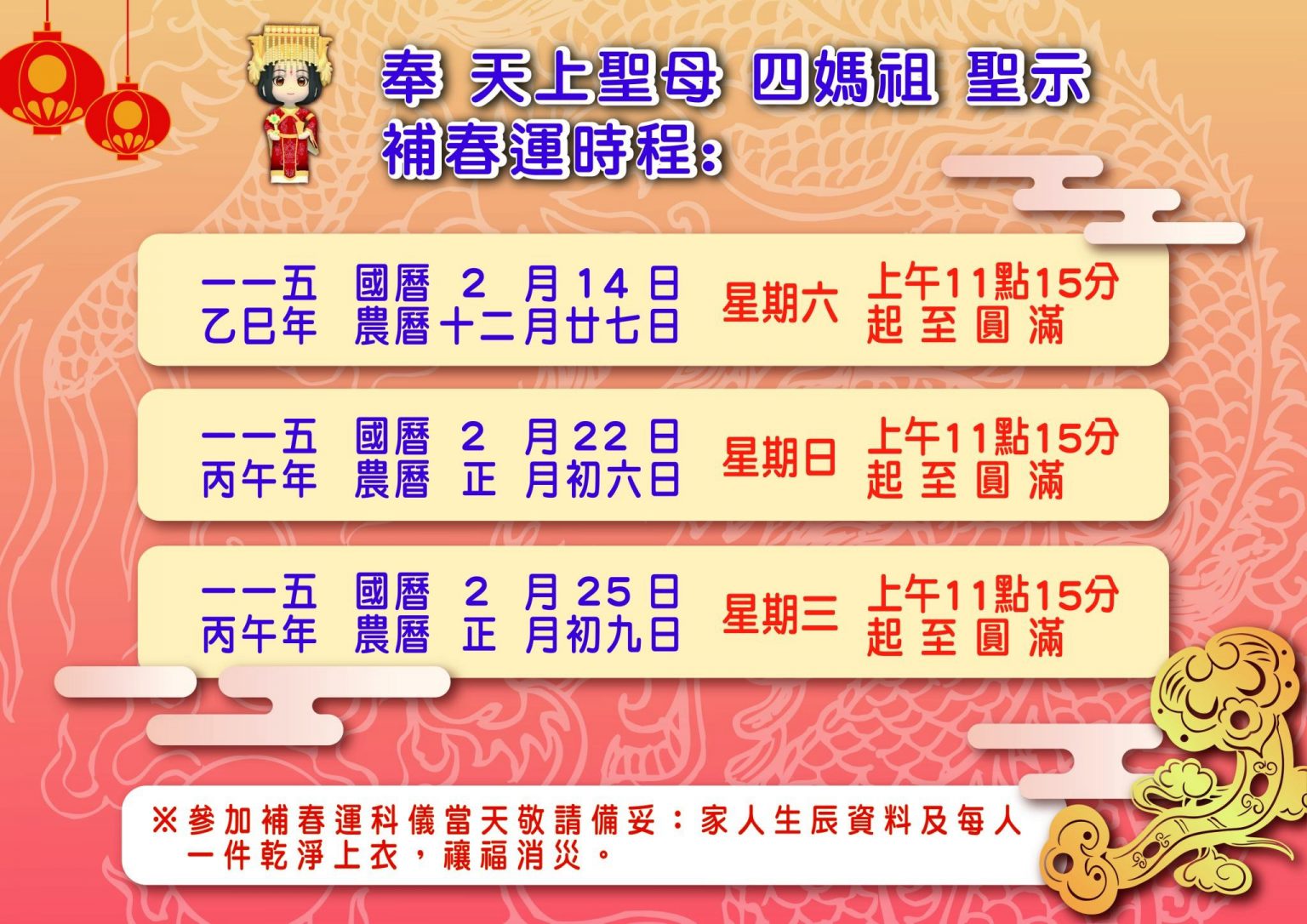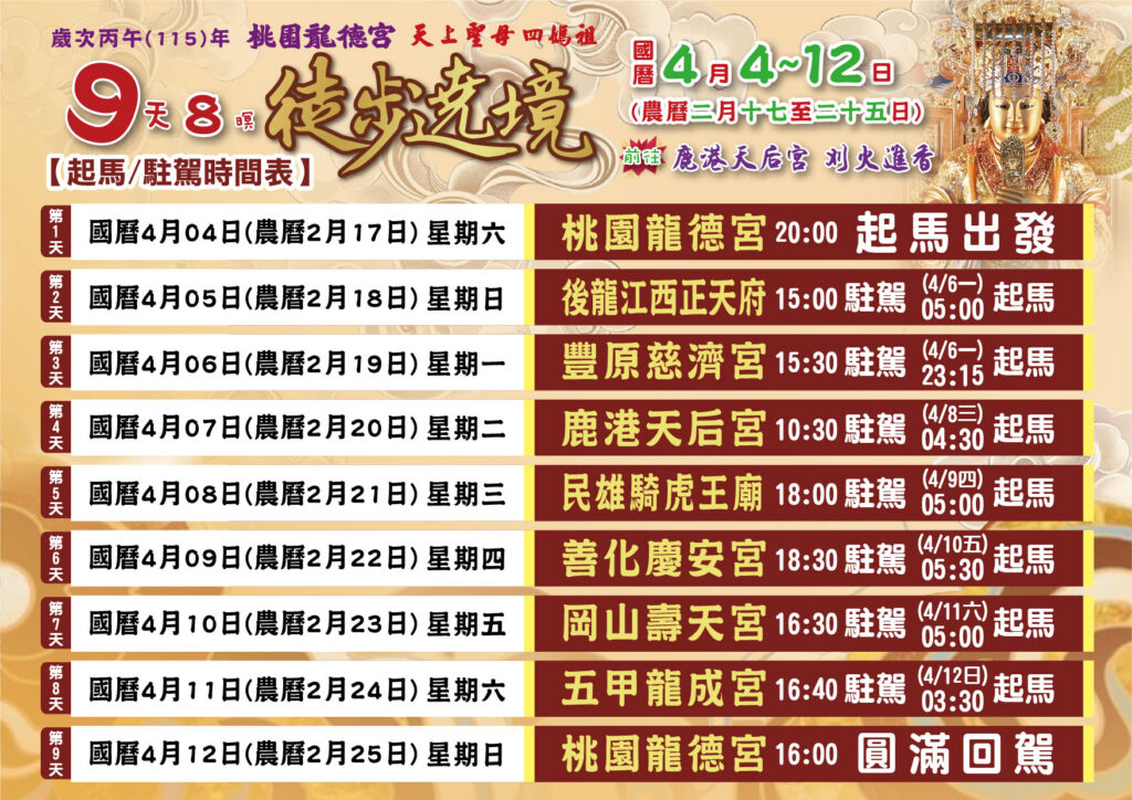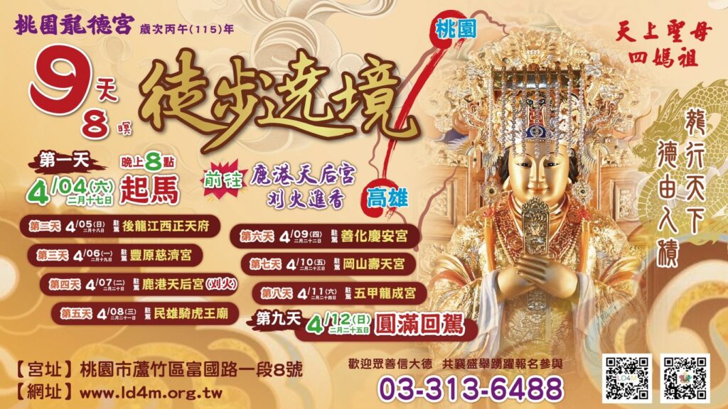 距離 丙午年遶境 訪客人數: 25813 明心智慧今年我想來點桃園龍德宮「明心智慧燈」 |馬上開啟 線上點燈月老財神不管是姻緣還是財源 在桃園龍德宮應該都點得到|馬上兌現 線上點燈功名健康不管是功名還是健康 在桃園龍德宮應該都點得到|馬上實現 線上點燈安太歲想安太歲不用出門 桃園龍德宮幫你『外送』平安|馬上安穩 線上點燈元辰光明今年我想來點桃園龍德宮「元辰光明燈」 |馬上發光 線上點燈 龍行天下 德由人積~祈安遶境,撫順安民,護持眾生。天上聖母 四媽祖聖駕南巡,引領十方善信,百里行腳,一步赦一業,消災解厄,福氣延綿。殷盼眾善信大德偕伴,行功了願步行訓體,普受神庥澤被,吉祥圓滿,是所至禱! 最新消息 辦聖事日期.安燈科儀 2026/01/28 閱讀全文 消災延壽七星平安橋 2026/01/10 閱讀全文 丙午(115)年開工吉日 2026/01/09 閱讀全文 十二生肖,怎樣點燈最有效 2025/12/4 閱讀全文 丙午(115)年補春運 2026/01/10 閱讀全文 丙午(115)年財利亨通發財金 2026/01/09 閱讀全文 丙午(115)年新春系列活動 2026/01/09 閱讀全文 丙午(115)年安太歲.點光明燈 2025/11/28 閱讀全文 遶境專區 丙午(115)年南巡祈安遶境 2025/11/19 閱讀全文 隨香公告 2025/01/01 閱讀全文 陣頭介紹 2025/01/01 閱讀全文 乙巳(114)年南巡祈安遶境【桃園區回駕路線圖】 2025/01/01 閱讀全文 丙午(115)年南巡祈安遶境-准假 2026/1/31 閱讀全文 遶境食素天數 2026/01/02 閱讀全文 行旅規範 2025/01/01 閱讀全文 行李袋購買 2025/01/01 閱讀全文 遶境介紹 媽祖信仰是臺灣人民最普遍的民間信仰之一,桃園龍德宮於每年初春奉行 玉皇上帝與天上聖母 四媽祖旨諭進行9天8夜徒步南巡祈安遶境活動,堪稱「轟動北台灣的媽祖遶境聖事」。天上聖母 四媽祖引領十方善信,百里行腳,一步赦一業,消災解厄,福氣綿延。殷盼善信大德偕伴護法隨駕,行功了願,秉奉丹心,步行訓體,得受神庥澤被,吉祥圓滿。 更多遶境介紹 龍行天下 德由人積 龍行天下 德由人積國曆115.04.04 – 04.12 (農曆02.17 – 02.25)徒步遶境 百里行腳 福氣綿延 攜手走向 希望之路 駐駕友宮 桃園龍德宮 後龍江西正天府 豐原慈濟宮 鹿港天后宮 民雄騎虎王廟 善化慶安宮 岡山壽天宮 五甲龍成宮 福報的秘密 福氣小物 Views: 7010