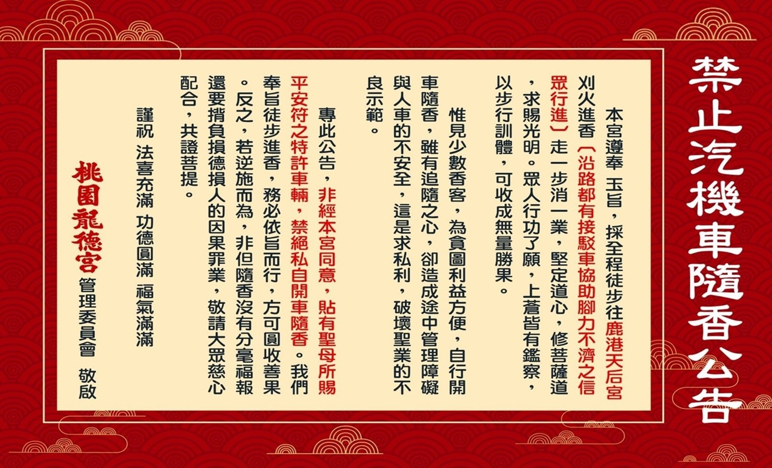 距離 丙午年遶境 訪客人數: 36278 龍行天下 德由人積~祈安遶境,撫順安民,護持眾生。天上聖母 四媽祖聖駕南巡,引領十方善信,百里行腳,一步赦一業,消災解厄,福氣延綿。殷盼眾善信大德偕伴,行功了願步行訓體,普受神庥澤被,吉祥圓滿,是所至禱! 明心智慧今年我想來點桃園龍德宮「明心智慧燈」 |馬上開啟 線上點燈月老財神不管是姻緣還是財源 在桃園龍德宮應該都點得到|馬上兌現 線上點燈功名健康不管是功名還是健康 在桃園龍德宮應該都點得到|馬上實現 線上點燈安太歲想安太歲不用出門 桃園龍德宮幫你『外送』平安|馬上安穩 線上點燈元辰光明今年我想來點桃園龍德宮「元辰光明燈」 |馬上發光 線上點燈 最新消息 丙午(115)年南巡祈安遶境 2026/02/19 閱讀全文 115年南巡遶境《願行》攝影比賽 2026/03/04 閱讀全文 丙午(115)年南巡祈安遶境【桃園區回駕路線圖】 2026/02/22 閱讀全文 隨香公告 2025/01/01 閱讀全文 陣頭介紹 2025/01/01 閱讀全文 丙午(115)年南巡祈安遶境-准假 2026/1/31 閱讀全文 遶境食素天數 2026/01/02 閱讀全文 行旅規範 2025/01/01 閱讀全文 行李袋購買 2025/01/01 閱讀全文 遶境介紹 媽祖信仰是臺灣人民最普遍的民間信仰之一,桃園龍德宮於每年初春奉行 玉皇上帝與天上聖母 四媽祖旨諭進行9天8夜徒步南巡祈安遶境活動,堪稱「轟動北台灣的媽祖遶境聖事」。天上聖母 四媽祖引領十方善信,百里行腳,一步赦一業,消災解厄,福氣綿延。殷盼善信大德偕伴護法隨駕,行功了願,秉奉丹心,步行訓體,得受神庥澤被,吉祥圓滿。 更多遶境介紹 龍行天下 德由人積 龍行天下 德由人積國曆115.04.04 – 04.12 (農曆02.17 – 02.25)徒步遶境 百里行腳 福氣綿延 攜手走向 希望之路 駐駕友宮 桃園龍德宮 後龍江西正天府 豐原慈濟宮 鹿港天后宮 民雄騎虎王廟 善化慶安宮 岡山壽天宮 五甲龍成宮 福報的秘密 福氣小物 Views: 10931
