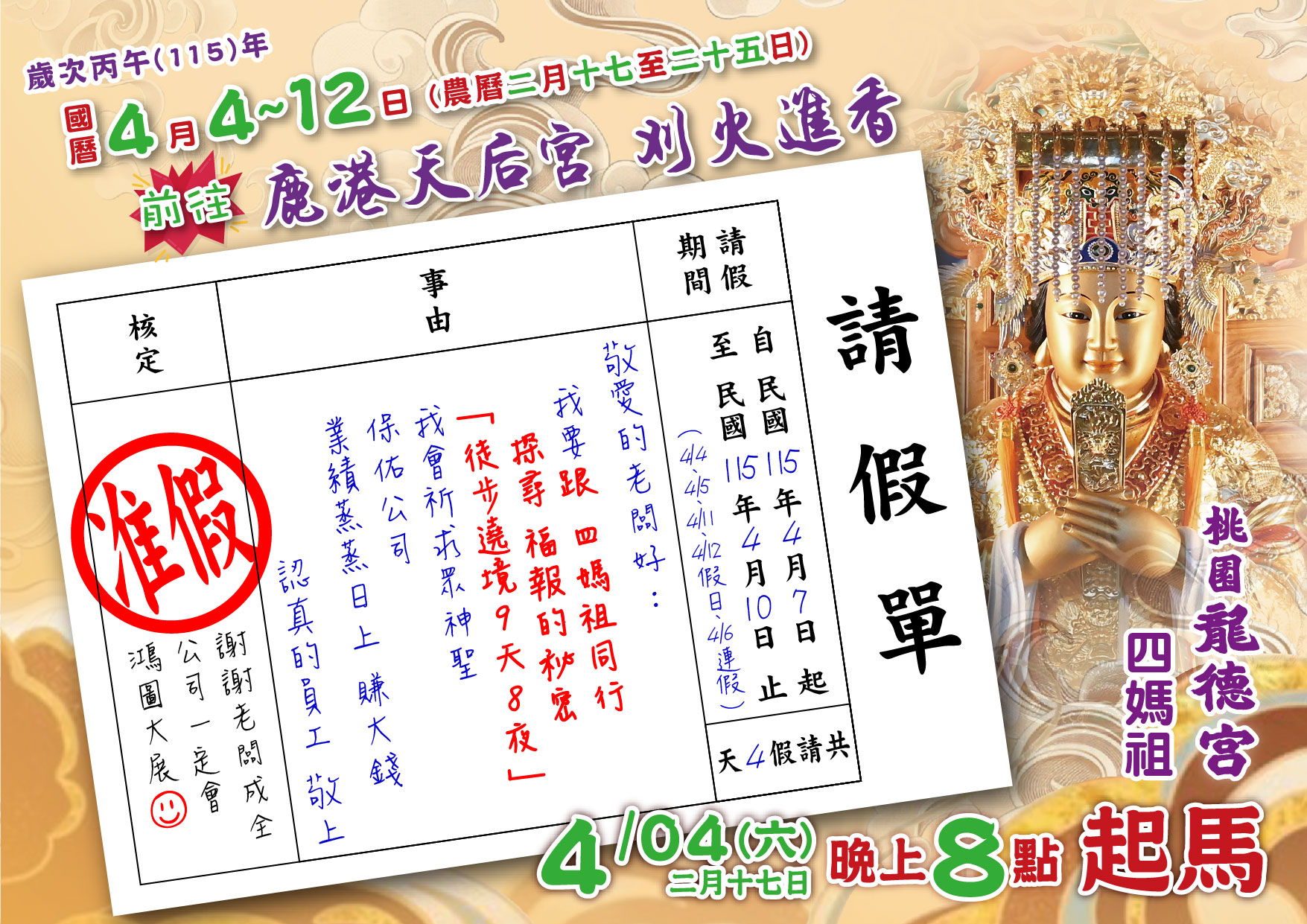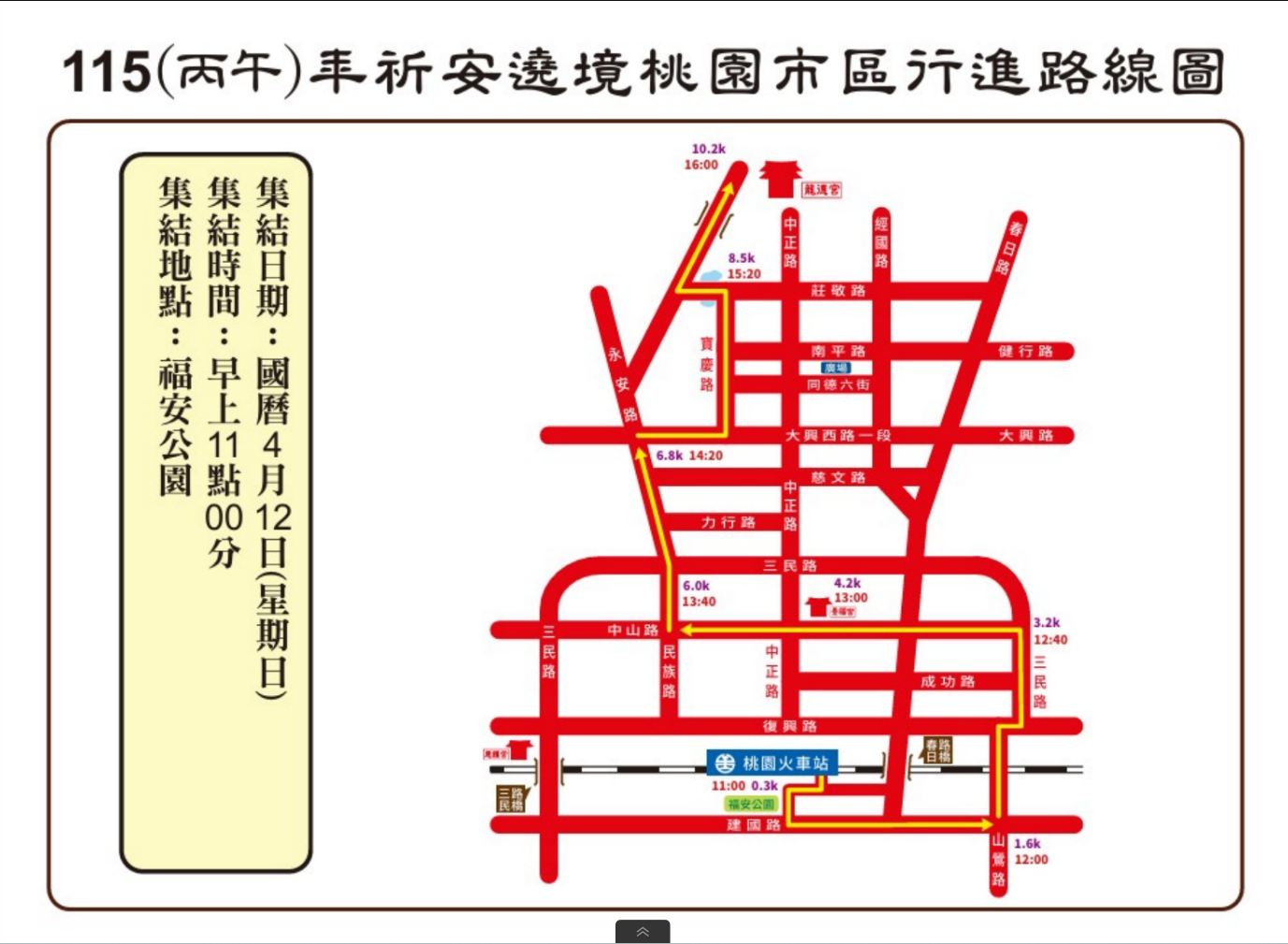 距離 丙午年遶境 訪客人數: 32983 明心智慧今年我想來點桃園龍德宮「明心智慧燈」 |馬上開啟 線上點燈月老財神不管是姻緣還是財源 在桃園龍德宮應該都點得到|馬上兌現 線上點燈功名健康不管是功名還是健康 在桃園龍德宮應該都點得到|馬上實現 線上點燈安太歲想安太歲不用出門 桃園龍德宮幫你『外送』平安|馬上安穩 線上點燈元辰光明今年我想來點桃園龍德宮「元辰光明燈」 |馬上發光 線上點燈 龍行天下 德由人積~祈安遶境,撫順安民,護持眾生。天上聖母 四媽祖聖駕南巡,引領十方善信,百里行腳,一步赦一業,消災解厄,福氣延綿。殷盼眾善信大德偕伴,行功了願步行訓體,普受神庥澤被,吉祥圓滿,是所至禱! 最新消息 丙午(115)年南巡祈安遶境 2025/11/19 閱讀全文 隨香公告 2025/01/01 閱讀全文 陣頭介紹 2025/01/01 閱讀全文 丙午(115)年南巡祈安遶境【桃園區回駕路線圖】 2026/02/22 閱讀全文 丙午(115)年南巡祈安遶境-准假 2026/1/31 閱讀全文 遶境食素天數 2026/01/02 閱讀全文 行旅規範 2025/01/01 閱讀全文 行李袋購買 2025/01/01 閱讀全文 遶境介紹 媽祖信仰是臺灣人民最普遍的民間信仰之一,桃園龍德宮於每年初春奉行 玉皇上帝與天上聖母 四媽祖旨諭進行9天8夜徒步南巡祈安遶境活動,堪稱「轟動北台灣的媽祖遶境聖事」。天上聖母 四媽祖引領十方善信,百里行腳,一步赦一業,消災解厄,福氣綿延。殷盼善信大德偕伴護法隨駕,行功了願,秉奉丹心,步行訓體,得受神庥澤被,吉祥圓滿。 更多遶境介紹 龍行天下 德由人積 龍行天下 德由人積國曆115.04.04 – 04.12 (農曆02.17 – 02.25)徒步遶境 百里行腳 福氣綿延 攜手走向 希望之路 駐駕友宮 桃園龍德宮 後龍江西正天府 豐原慈濟宮 鹿港天后宮 民雄騎虎王廟 善化慶安宮 岡山壽天宮 五甲龍成宮 福報的秘密 福氣小物 Views: 9208